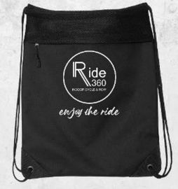 Drawstring backpack with zipper pouch. Perfect size for your water bottle and cycling shoes. 14x17